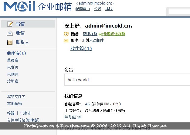 对于新产品,总是想要尝试下,腾讯最近推出企业邮箱,对于邮箱团队,我有着千丝万缕的关系,于是马上拿来了一个邀请码去试用了下,现在奉上报告: